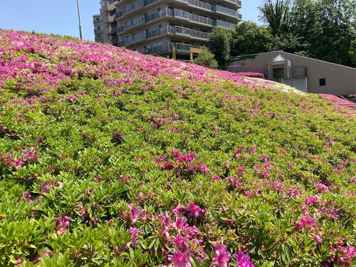 国際プールへの階段 ツツジが満開です 山田富士公園の池でも睡蓮 カキツバタや アヤメも 春がどんどん過ぎて行きます