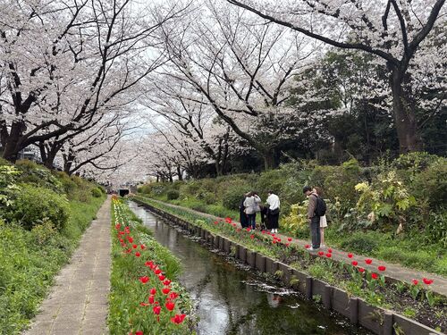 緑産業道路根岸から江川沿いを行きます 1週間ですっかり満開になってます 岩崎橋からは 満開の桜とチューリップが迎えてくれます 満開のサクラのトンネルです 整然と並ぶチューリップが川辺を飾ります 川辺に白いチューリップ 左岸の白い花は スイセンです …